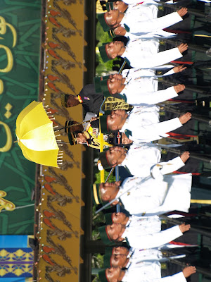 The downtown streets are festooned with huge banners of congratulations and all city buildings such banks, shopping malls, public buildings, the headquarters of the airline, etc. in their facades look great pictures with the image of the monarch and the country's flag. We stayed in the Sultan Julan avenue which already focuses a lot of people looking forward to his majesty. In the center of the plaza, on the grass, stiff as sticks and sweating are still soldiers of different armies. In the stands sit under cover of government personalities, family and other VIP's.
